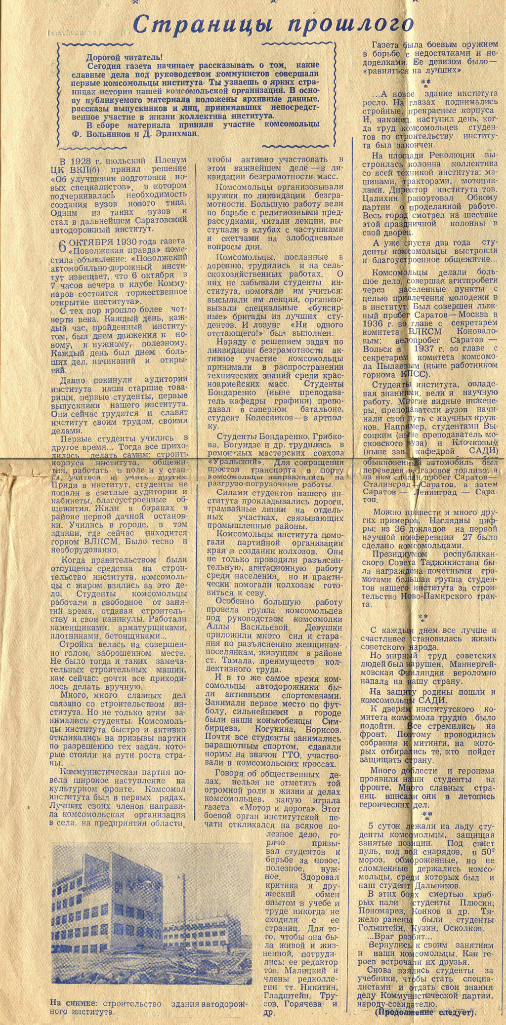 У наших предшественников были другие темпы. В начале июня 1930 г. руководители Крайдортранса предложили Е.М. Цалихину открыть в Саратове автодорожный институт. Через несколько дней Евсей Маркович передает в крайком ВКП(б) и Крайисполком подготовленное им обоснование открытия такого института.