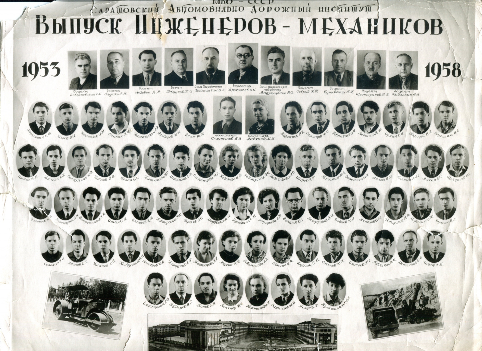 | 1941 г. | ![]() | Выпускная фотография Автомобильный факультет Выпуск 1941 года Материалы Музея истории СГТУ имени Гагарина Ю.А. | |