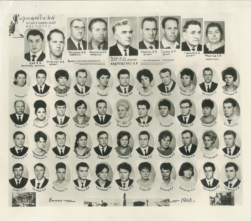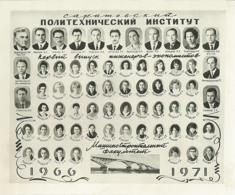 | ![]() | Выпускная фотография Строительный факультет Выпуск 1967 г. Дорожные строители Материалы Музея истории СГТУ имени Гагарина Ю.А. | |