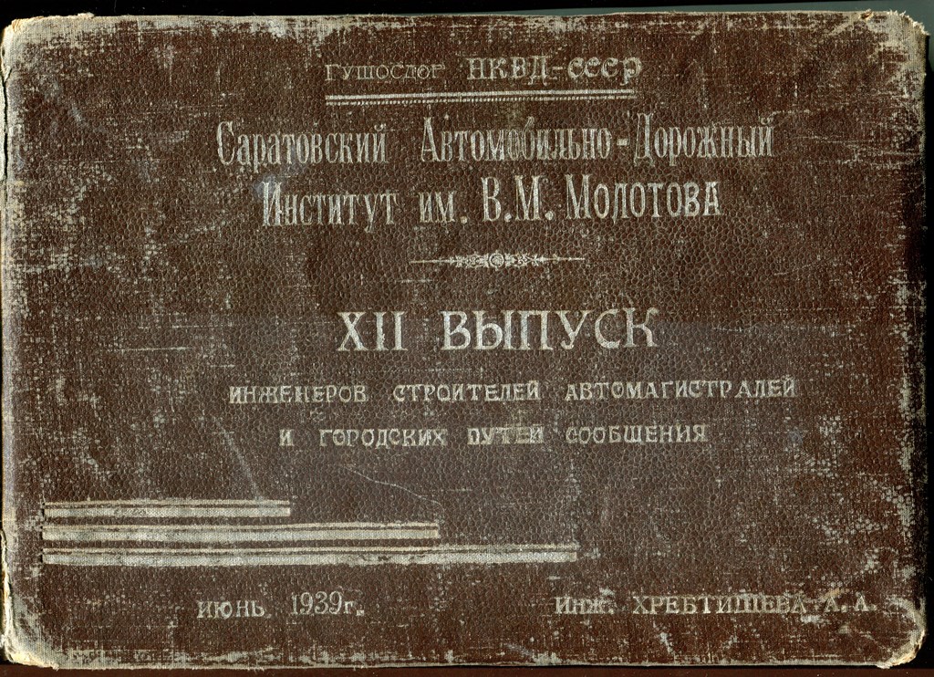 Оцифрован выпускной альбом 1939 года Дорожно-строительного факультета САДИ. Альбом посвящен студентам XII выпуска инженеров строителей автомагистралей и городских путей сообщения и их преподавателям.